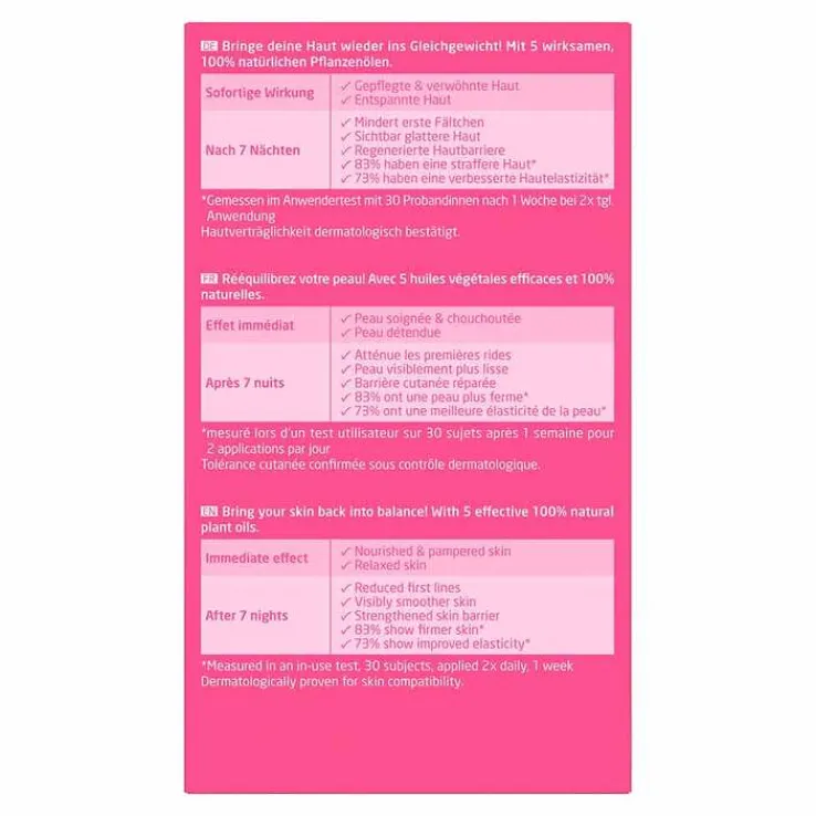 Die Wildrose 7 Tage glättenden Schönheits-Kur mindert erste Fältchen und verleiht der Haut in kurzer Zeit mehr Ausstrahlung. Sie bringt die Haut wieder ins Gleichgewicht. Die Intensiv-Kur enthält 5 wirksame, 100 % natürliche Pflanzenöle.