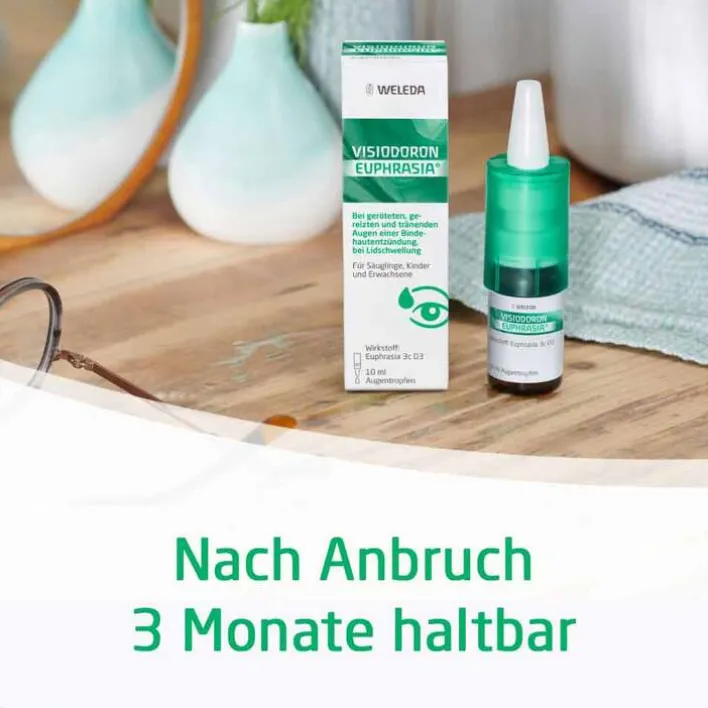 Visiodoron Euphrasia® Augentropfen Wirkstoff: Euphrasia 3c D3 Gemäß der anthroposophischen Menschen- und Naturerkenntnis. Dazu gehören: Katarrhalische Entzündungen am Auge, die mit vermehrter Tränenabsonderung einhergehen; Lidödeme, vor allem auf allergischer Grundlage. Dosierung und Art der Anwendung Soweit nicht anders verordnet, 3-mal täglich 1 Tropfen in den Bindehautsack träufeln. Zu Risiken und Nebenwirkungen lesen Sie die Packungsbeilage und fragen Sie Ihre Ärztin, Ihren Arzt oder in Ihrer Apotheke. Weleda AG, Schwäbisch Gmünd
