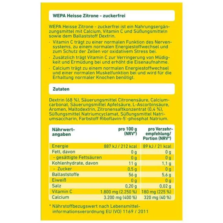 Schreibe die erste Bewertung für „Wepa heiße Zitrone + Vitamin C + Calcium zuckerfrei Pulver, 10X10 g“ Antworten abbrechen