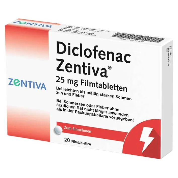 Diclofenac Zentiva® 25 mg Filmtabletten. Wirkstoff: Diclofenac Kalium.Anw.-Geb.: Symptomatische Behandlung von leichten bis mäßig starken Schmerzen und Fieber bei Erwachsenen und Jugendlichen ab 16 Jahren. Warnhinweis: Bei Schmerzen oder Fieber ohne ärztlichen Rat nicht länger anwenden als in der Packungsbeilage vorgegeben! Hinweis: Ohne Rücksprache mit dem Arzt beträgt die Anwendungsdauer bei leichten bis mäßig starken Schmerzen 4 Tage bzw. bei Fieber 3 Tage. Bei Beschwerden, die länger anhalten oder sich verschlimmern, sollte ein Arzt aufgesucht werden. Apothekenpflichtig. Zu Risiken und Nebenwirkungen lesen Sie die Packungsbeilage und fragen Sie Ihre Ärztin, Ihren Arzt oder in Ihrer Apotheke. Winthrop Arzneimittel GmbH, 65927 Frankfurt am Main. Mitvertrieb: Zentiva Pharma GmbH, 65927 Frankfurt am Main. Stand: Oktober 2019