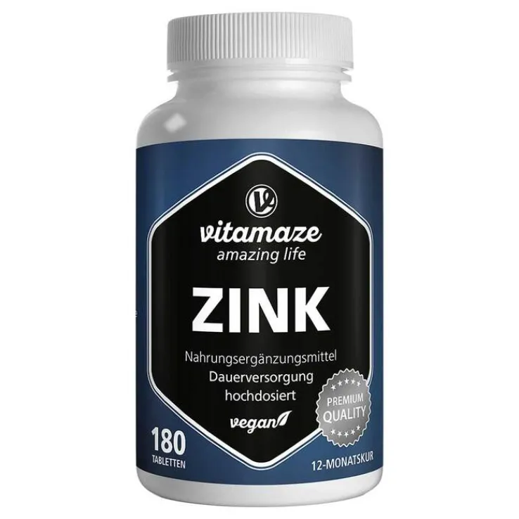 Zink erfüllt wichtige Aufgaben in unserem Körper, z. B. im Immunsystem und bei der Fortpflanzung. Es kann nicht vom Körper selbst gebildet werden und muss regelmäßig zugeführt werden. Da Zink überwiegend über tierische Lebensmittel aufgenommen wird, ist auch für Vegetarier und Veganer wichtig, auf eine ausreichende Zufuhr zu achten. Um in solchen Fällen eine gute Versorgung sicherzustellen, kann man mit Vitamaze Zink 25 mg Tabletten ergänzen. Sie unterstützen die Erhaltung normaler Haut und gesunder Haare, schützt die Zellen vor oxidativem Stress und trägt zur Erhaltung normaler Sehkraft und Knochen bei. Ebenso trägt Zink zu einer normalen Fruchtbarkeit und Reproduktion, ein normalen Testosteronspiegel im Blut und einem normalen Säure-Basen-Stoffwechsel bei.