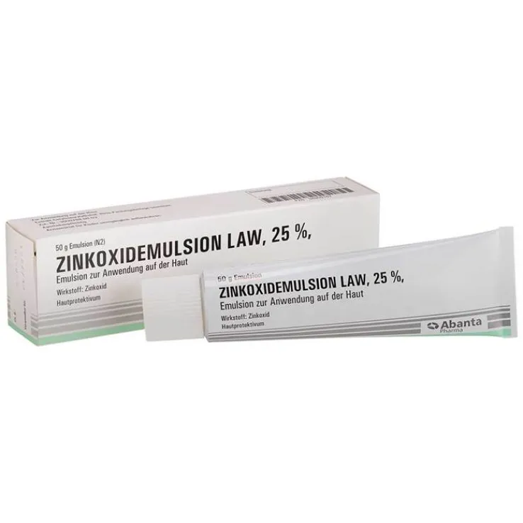 ZINKOXIDEMULSION LAW, 25 %. Wirkstoff: Zinkoxid. Anwendungsgebiet: Zur Abdeckung und zum Schutz der gesunden Haut und zur Sekretbindung bei nässenden und subakuten Dermatosen. Warnhinweis: enthält Cetylstearylalkohol. Apothekenpflichtig. Zu Risiken und Nebenwirkungen lesen Sie die Packungsbeilage und fragen Sie Ihre Ärztin, Ihren Arzt oder in Ihrer Apotheke. Abanta Pharma GmbH