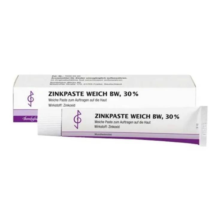 Zinkpaste weich BW, 30 %.Wirkstoff: Zinkoxid. Wundheilmittel, äußerliche Anwendung zur Unterstützung einer Therapie von subakuten und chronischen Ekzemen; beim Wundsein der Haut im intertriginösen Bereich durch Scheuern und Feuchtigkeit; bei Windeldermatitis; zur Abdeckung der Umgebung von Unterschenkelgeschwüren (Ulcus cruris). Zu Risiken und Nebenwirkungen lesen Sie die Packungsbeilage und fragen Sie Ihre Ärztin, Ihren Arzt oder in Ihrer Apotheke. Bombastus-Werke AG, 01705 Freital, Deutschland